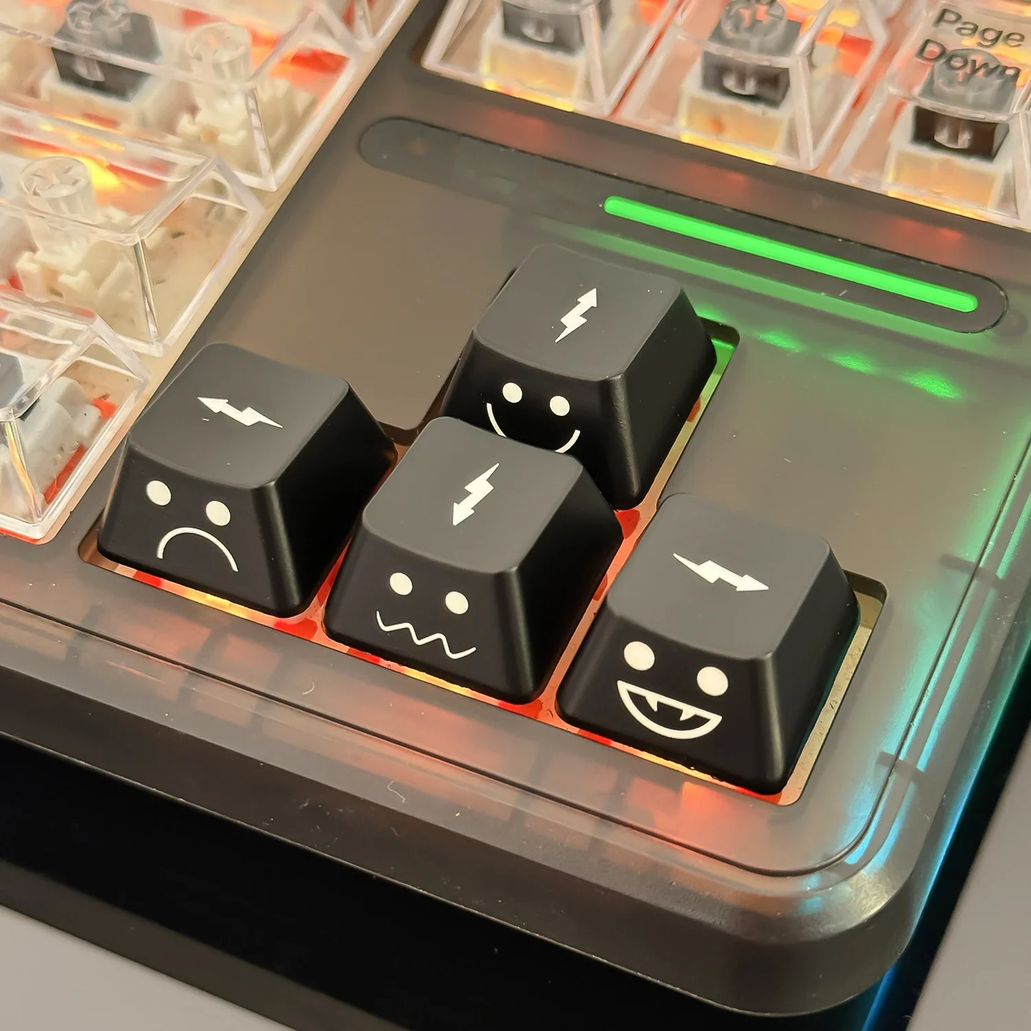 【Unique Emoji Design】: These emoji themed keycaps feature cute and expressive emoji patterns, adding a touch of personality and fun to your mechanical keyboard. The black side translucent design ensures a sleek and modern look. 【High-quality Materials】: Made from durable ABS material, these keycaps are built to last. This material ensures a smooth and comfortable typing experience, while the high-quality construction ensures long-lasting durability. 【Customizable】: Designed to fit standard mechanical keyboards, these keycaps are perfect for customizing your WASD or arrow keys. They provide a unique and personalized touch to your keyboard setup. 【Backlight Compatible】: The side translucent design provides excellent backlighting, ensuring your keyboard remains clearly visible and stylish even in low-light conditions. The black color provides a sleek and modern background for the emoji pattern. 【Quantity and Packaging】: Each pack contains 4 emoji keycaps, providing a unique and fun set of replacement keycaps for your keyboard. The ample quantity ensures that you can easily customize multiple keys.  Pattern: Expression Color: Black side-transparent Applicable: Direction keys/WASD keys Size: The height is approximately 9.1mm Material: ABS Package includes:4/8*Keycaps